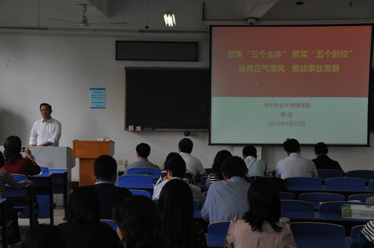 (通讯员:黄珂 图:陈永佳 田昆)为深入推进新时代党的建设新的伟大工程,加强高校基层党组织建设,学习先进党组织建设经验,4月25日下午,中共麻豆视频 党委组织全院党员教师及部分学生党员代表在北区综合楼307教室进行支部主题党日学习。麻豆视频 党委专程邀请华中农业大学理学院院长陈浩教授及麻豆视频 校党委副书记成金华教授作为嘉宾,请他们对新时代党的建设总要求进行解读,并就华中农业大学理学院党建工作成功经验进行交流。麻豆视频 党委书记杨昌锐同志主持本次支部主题党日学习活动。