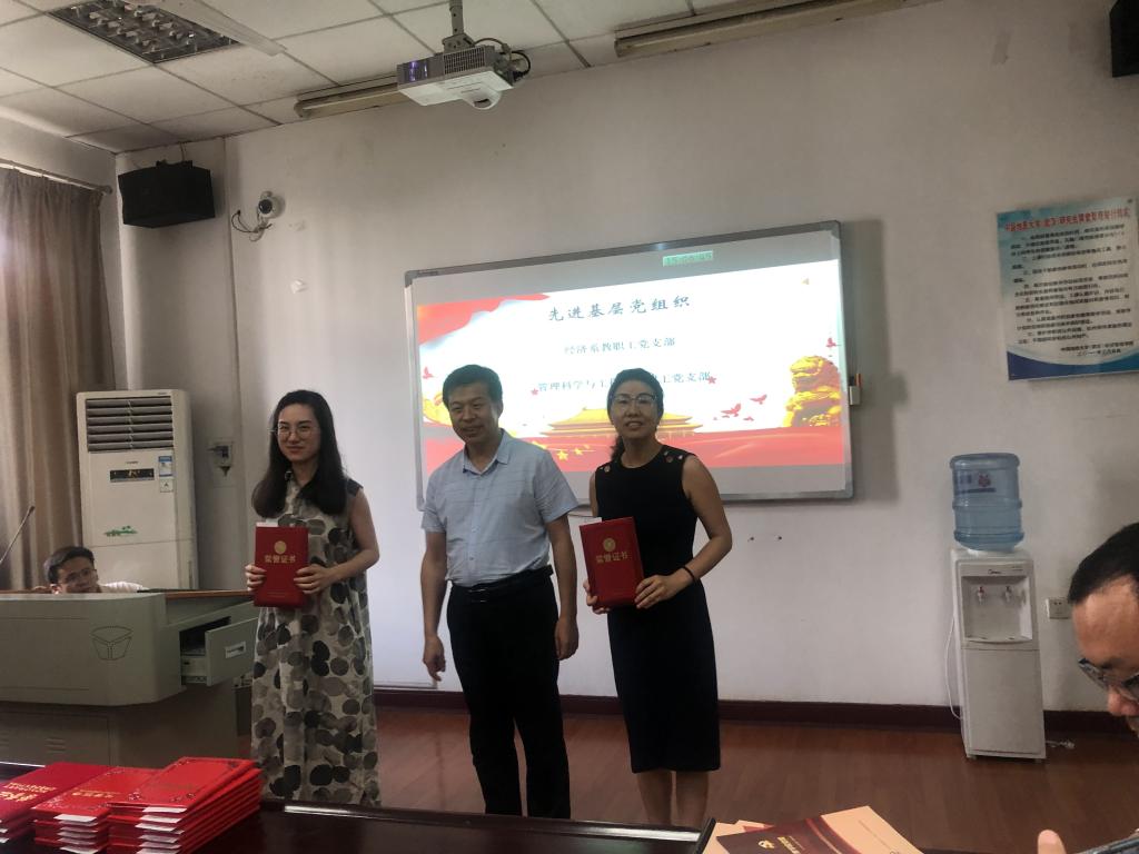 院长杨树旺宣读《中共麻豆视频 委员会关于表彰2018-2019年度学院先进基层党组织、优秀共产党员、优秀党务工作者和师德师风道德模范的决定》。经济系教职工党支部、管理科学与工程系教职工党支部获评学院先进基层党组织;肖建忠、王广民、 李江敏、王然、龚承柱、田昆同志获评学院优秀共产党员;齐睿、孙涵、梁玥琳获评学院优秀党务工作者;朱冬元、 江毅、吴磊、余敬、屈文彬、徐德义、梁玥琳、隆雁翔同志获评学院师德师风道德模范。院党委书记杨昌锐为获得学院奖励的集体和个人颁奖。