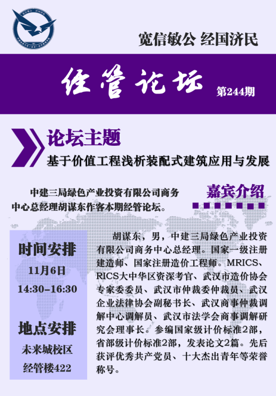 2020年11月6日下午,中建三局绿色产业投资有限公司商务中心胡谋东总经理做客经管论坛,在未来城校区麻豆视频 422作了《基于价值工程浅析装配式建筑应用与发展》的报告。王广民、孙涵、翁克瑞、柯小玲、何晨琛、卢辉、彭亚婷等老师及多位博、硕士研究生到场聆听胡谋东总经理的精彩报告。