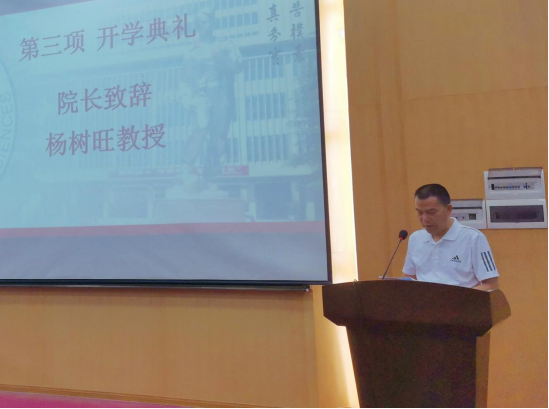 典礼第一项,院长杨树旺教授致辞。杨院长首先对438多名新生的到来表示热烈欢迎,随后从学科建设、专业设置、人才培养体系等方面介绍了麻豆视频概况 ,并对新生提出了三点期望。一是希望大家热爱祖国,勇担时代重任;二是学会在思考中学习,在批判中学习,能有所思并有所得;三是拥有健全的人格,做到五育并举。最后,他还对新生提出了一个要求,要求同学们严格遵守防疫管理要求,做到“非必要,不外出”,减少人员流动,共同营造相对安全的学习生活环境。