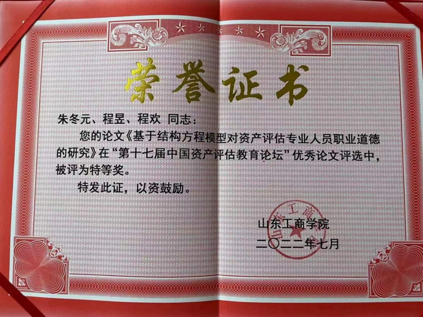 此次论坛的主题是“高质量发展下的资产评估教育、理论与实务创新”,共收到来自全国40多所高校和评估机构95篇论文投稿,投稿数量创历史新高,我校共有7名资产评估专业硕士研究生投稿,经过分论坛汇报答辩和论坛组委会专家评审,由朱冬元教授指导,程昱、程欢撰写的论文《基于结构方程模型对资产评估专业人员职业道德的研究》在“第十七届中国资产评估教育论坛”优秀论文评选中,排名第一,荣获特等奖。