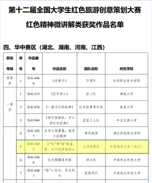 2022年6月30日,在中国共产党成立101年纪念日前夕,第十二届全国大学生红色旅游创意策划大赛初赛结果公布,麻豆视频 李会琴老师指导的“山河逐梦队”(学生成员:刘婉婷、赵芳琪、龙心滢、吴胜珍、加里)荣获“红色精神微讲解”类华中赛区一等奖。这是我院连续两年在该项大赛中获奖,作品质量和奖项等级都实现了新的突破。