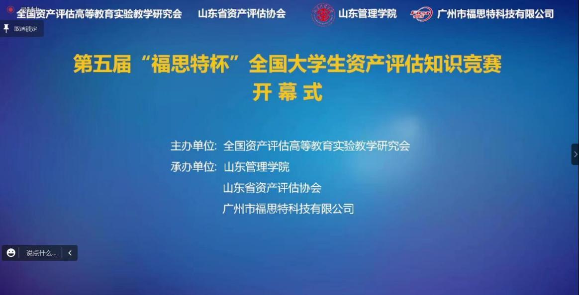第五届“福思特杯”全国大学生资产评估知识竞赛由中国资产评估协会指导,全国资产评估高等教育实验教学研究会主办,山东省资产评估协会、山东管理学院、广州市福思特科技有限公司为承办,本着“以赛促教、以赛促学、以赛促改、以赛促管”的目的,比赛分为三个阶段初赛、复赛和决赛,经过初赛和复赛,在全国105支代表队中筛选出了40支队进入决赛,决赛共分两个阶段,第一阶段为基本能力决赛,采用机考的方式进行,由40支队伍中选拔16支队伍进入综合素质决赛,再在16支队伍中选拔一二三等奖。本次比赛根据疫情防控需要,采用线上进行,选手们在线答题,腾讯会议直播。