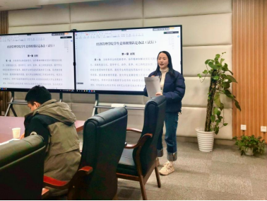 会议第二项,辅导员徐媛老师就学院近期指定的竞赛分级认定办法征集了在会同学意见。徐媛老师介绍到,本次竞赛分级认定办法修改,意在引导广大同学积极参与经济管理学科领域内的各项赛事,落实学校培养专业型人才的要求,提升学生的专业素养。谢诗卉、王铭铭、梁艾西等同学分别从本研不同层次、学科专业特点、备赛过程和成果等角度提出对认定办法的意见、建议。李少杰副书记和徐媛老师予以积极解答,并做好整理记录。