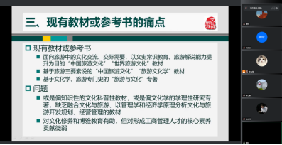 “文化与旅游”教学团队负责人周玲老师从课程基本情况、教学实施与反馈、教材编写三个方面进行了汇报。“文化与旅游”课程是我校2019版工商大类学科本科培养计划中的学科基础课,2020年至今开课3轮。周玲老师分别从教学内容与环节、教学方法、课程教学环节与考核总结教学经验,分析目前存在的问题,提出可行的完善措施;并针对下一步课程教材编写重难点内容和进度计划进行安排。