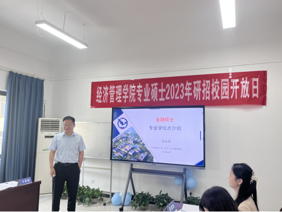 金融与贸易系白永亮老师首先向同学们介绍了金融行业对学科人才的需求,然后详细介绍了我校金融专硕学位点的建设基础与支撑学科、培养目标与学科培养优势与特色方向。他介绍到我院于去年和今年分别承办了2022中国绿色金融学术年会、2023气候投融资国际论坛暨丝路讲坛,为金融学科发展提供交流的平台。