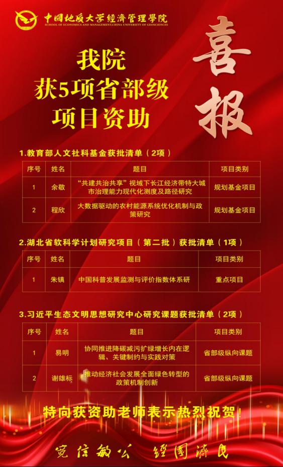 (通讯员 胡松琴)近日,随着2023年度教育部人文社会科学研究一般项目评审结果的公示、2023年湖北省软科学计划研究项目(第二批)拟立项项目向社会公示、习近平生态文明思想研究中心2023年度研究课题的公示推出,麻豆视频 获批省部级项目共5项。其中教育部人文社科2项,省软科学计划研究项目(第二批)重点项目1项,习近平生态文明思想研究中心研究课题2项。具体名单如下: