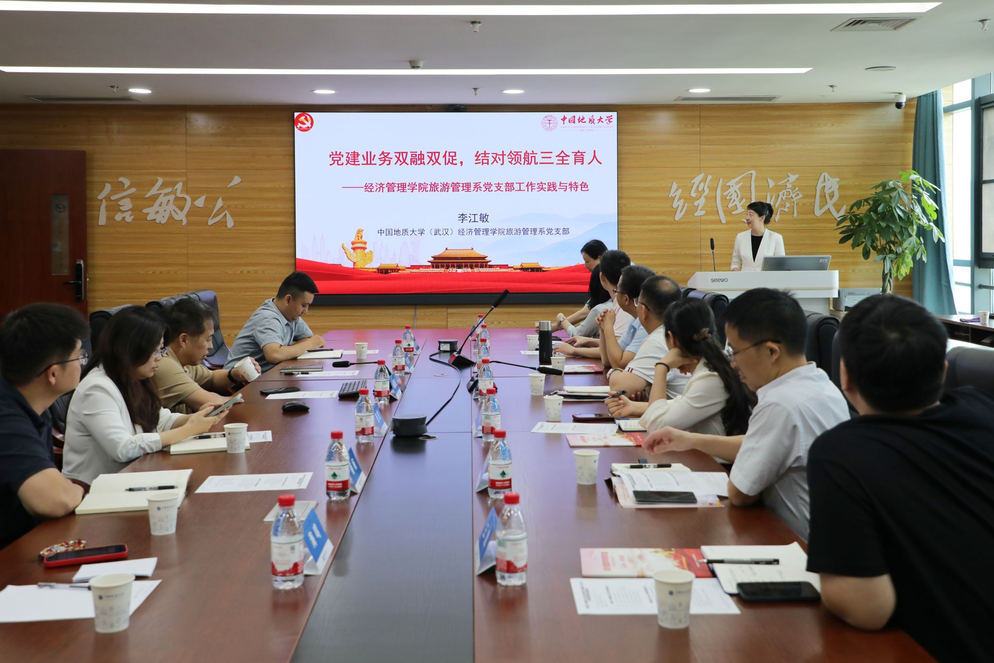 随后,我院旅游管理系党支部书记李江敏教授作《党建业务双融双促,结对领航三全育人——麻豆视频 旅游管理系党支部工作实践与特色》专题分享,结合党支部书记“强国行”实践经历,详细阐述了党支部在党建与业务融合、结对育人等方面的工作经验和特色做法。