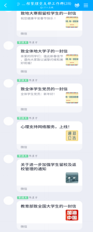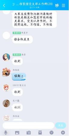 党支部全面关注同学健康和思想状况。支部党员立足所在班级关注每位同学的身体健康状况,配合专业辅导员做好同学健康统计工作。支部党员利用QQ群、微信群、空间动态、微博和朋友圈等各种渠道了解本班级或本专业同学的思想状况和生活动态,及时掌握舆情。支部党员邹成同志入党以来一直担任089162班班长,从2月7日起,该同志便积极响应党支部号召,每天在班级群中统计班里同学的身体健康状况,一人不少、一天不漏。