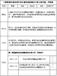 面对疫情,不仅仅要做到“停课不停学”,更要做到“停课不停育”,持之以恒、克服困难抓好对团员和入党积极分子的培养教育和考察工作。支部对所辖4个年级共36名入党积极分子进行集中统一线上培养教育考察,以个人书面汇报、培养联系人“一对一”线上谈话等方式,深入了解每一位积极分子的思想、学习、生活、工作情况,耐心引导、翔实记录,形成了36份电子版考察报告,要求入党积极分子以党员的标准严格要求自己,坚定“四个自信”、增强“四个意识”,自觉做到“两个维护”,深刻认识到做好疫情防控的重要性和紧迫性,为全国疫情防控做出应有贡献。