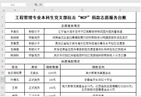 建立党支部抗击疫情捐款志愿服务台账。疫情爆发后,支部第一时间召开线上会议,以支部名义向地大教育发展基金会“抗击新型肺炎基金”项目捐款1000元。在党支部的影响下,支部党员和积极分子以个人名义主动向各地慈善机构捐款捐物。支部及时建立捐款志愿服务台账,如实记录每位同志的爱心善举。截止3月11日,共有五名同志参加了抗击疫情志愿者活动,党员和积极分子累计捐款总额4456.2元。