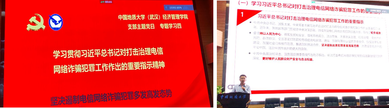 随后,院直党支部党员、院学工组专职辅导员赵家玮同志就当前全国上下正在开展的“防诈骗安全警示教育”活动,带领师生一起学习了习近平总书记对打击治理电信网络诈骗犯罪工作作出的重要指示精神,然后宣讲了学校和学院的系列部署和行动,通报了各学系和学生班级开展警示教育活动的进展情况,并要求和倡导全体师生要自觉扛起防诈防骗的个人主体责任,提高警惕,加强防控,落实措施,为创建零诈骗发生率的平安校园作出贡献。