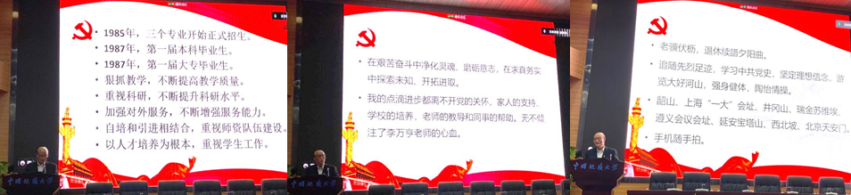 回首风雨兼程路,历览家国峥嵘史,杨昌明教授的党课引领全院师生追忆党史校史院史、传承奋斗精神,为把学院建设成为特色鲜明的高水平研究型学院而努力奋斗。学院党委书记杨昌锐同志代表全院师生感谢杨昌明教授的精彩报告,并号召全院师生学习好、感悟好、传承好老一辈地大人干事创业、爱岗敬业的精神品质和优良传统,珍惜历史、研究历史、铭记历史,在脚踏实地、奋力拼搏中,争做精神薪火的传承者、走在时代前列的奋进者、推动事业发展的开拓者。