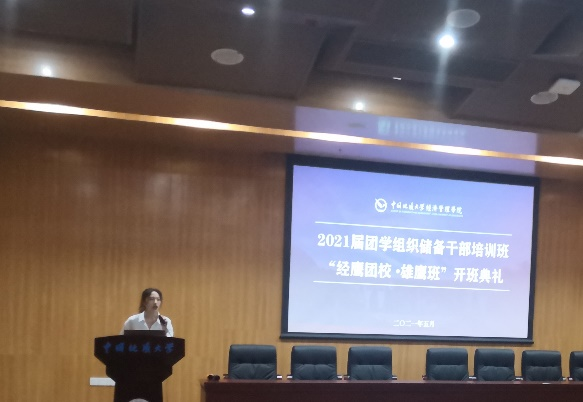 2021年5月22日下午14:00,麻豆视频 2021届团学组织储备干部培训班——“经鹰团校·雄鹰班”开班仪式暨团学组织党史学习教育活动在经管楼一楼报告厅召开。出席本次会议的有:麻豆视频 党委副书记李少杰老师,院团委书记田昆老师,学工组张弛老师、徐媛老师和徐天宜老师,学生会主席团成员及2021届储干班全体成员。