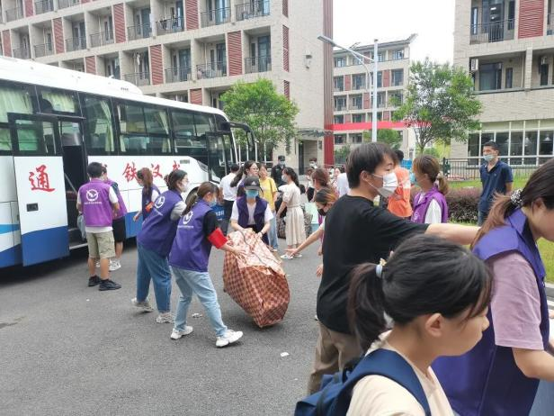 搬迁当天,学院党政领导、师生党员按照既定方案分别前往南望山校区和未来城校区,在各自的岗位上做好现场组织协调、帮助搬运行李等工作。同时,学院党委设置党员先锋服务岗,将学生劳动教育与志愿服务相结合,组织暑期留校的100余名学生党员和入党积极分子组成“党员搬迁服务队”,服务队队员佩戴党徽和袖标,分工合作,冒雨值守在接车点,奋斗在雨中抢搬行李。最终,在学院领导、师生党员志愿者的组织与帮助下,2020级全体本科生克服疫情影响、夏日酷暑、暴雨侵袭,用一天半的时间有序完成了搬迁工作,开始了新校区的学习篇章。
