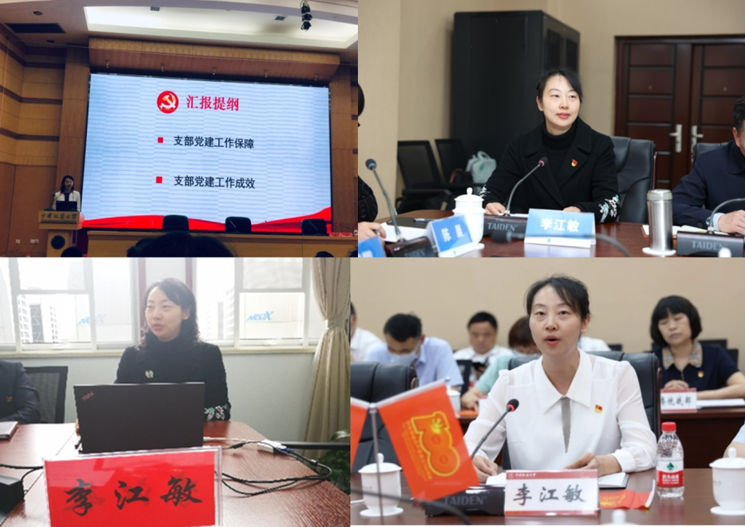 支部积极参与并利用校内外党建工作专题会、党建论坛、座谈活动等机会,及时汇报工作进展,提炼总结工作经验和模式、反思不足,交流展示自身党建工作特色和支部风采,学习校内外优秀党建案例及其工作方法和经验,不断推进自身党建工作向前迈进。党支部书记李江敏先后参与2019年3月河南科技大学来校进行党建工作交流座谈会、2019年5月校党建工作专题会,就全国党建工作“样板支部”创建工作作交流发言。2021年建党100周年庆祝大会及座谈,参加湖北省委常委、组织部部长李荣灿来校宣讲党的十九届六中全会精神座谈会并发言。