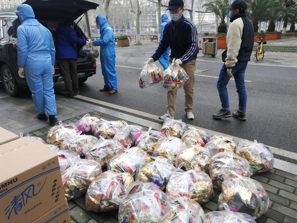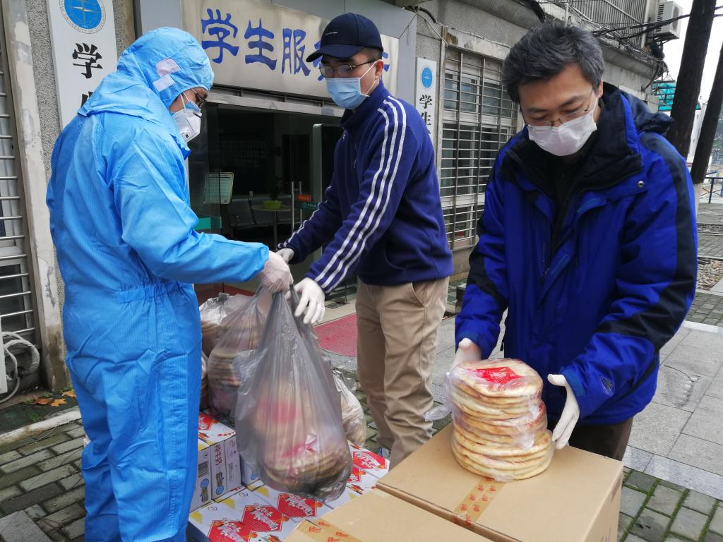 在武汉封城、物资难寻等重重困难中,我校麻豆视频 迪力木拉提•亚力坤等4位新疆籍同学远在家乡,在老师、同学和校友们的共同努力下,为期5天内,联系到3家供货商的馕、牛奶、烤鸡腿、香肠、方便面、干果、抽纸巾等12种硬核援助物资,全部提供给了我校学生工作处,并委托学工处将物资分发给留校的同学们。26日下午,物资抵达学校,经学工处、保卫处和经管学院的老师们前期协调和有力组织下,留校学生临时党支部的同学积极配合,有序将物资分发到了每一位留校同学的手中。