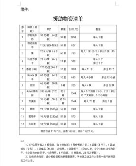 据了解,本次援助物资每1份包括:1箱伊利纯牛奶、1袋馕(5个)、1袋抽纸巾(6包)、1大袋食品(1袋核桃、1袋葡萄干、1袋大红枣、5个Albini巧克力饼干、4小袋Rondo饼干、4块月饼、5个鸡腿、11根香肠、23包方便面)。